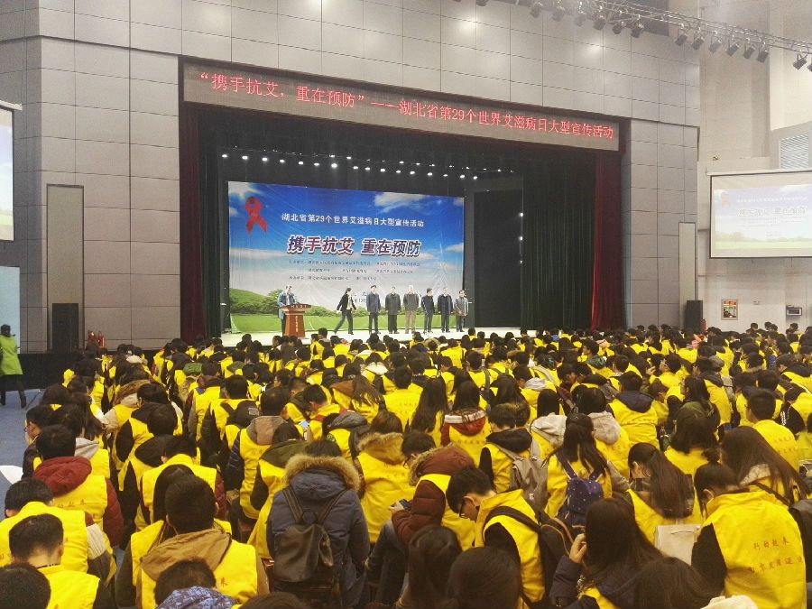 (通讯员 张雨舟)12月1日上午,由湖北省政府防艾办、省卫生计生委、省教育厅、共青团团省委和省禁毒办共同举办的湖北省第29个世界艾滋病日主题宣传暨大学校园艾滋病防治警示教育展宣传活动在华中科技大学的韵苑体育馆举行,此次的宣传主题为“携手抗艾,重在预防”,共11所学校的600余名师到场,其中,我校的40名学生代表在现场参加了此次宣传活动。