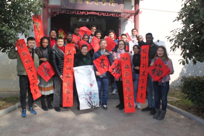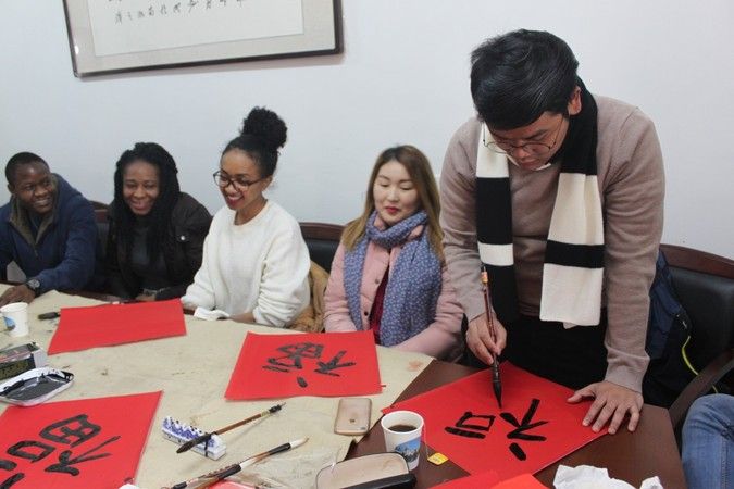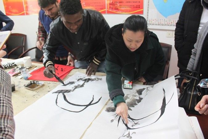 团拜会举行之前,国际教育学院举行了留学生春节传统年俗体验活动。在校留学生和教师一起写春联、画国画、吃年饭,共贺中国狗年新春。留学生在书法指导老师熊治国和国画老师马幼兰的指导下,体验各项不同的传统年俗艺术,师生们其乐融融,节日的气氛感染了现场所有人。