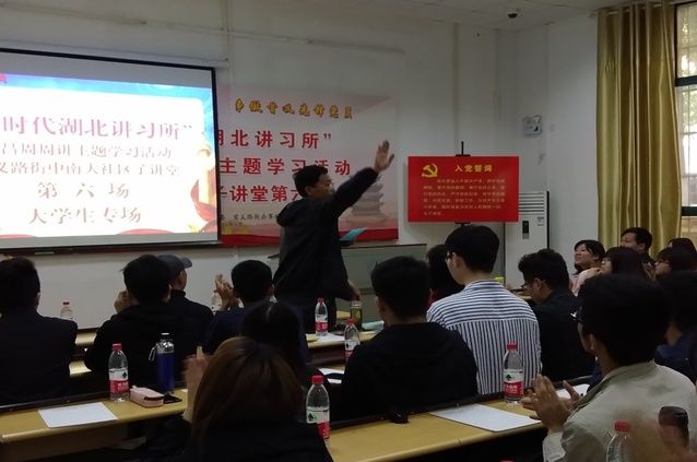 4月26日16时,由财政税务学院、首义路街党建办和中南大社区共同举办的“传承黄旭华精神,争做首义先锋党员”主题学习活动在首义校区30栋楼105教室举行。武昌区首义路街办事处副主任张林,财政税务学院党委副书记熊思宏,武昌区首义路党建办陈光明科长、方继斌科长,17级辅导员石凌,尼加提·雪莲花志愿服务队副队长、雪莲花育苗助学金计划项目委员会主任沈瑶以及财政税务学院17级入党积极分子参加了此次活动。