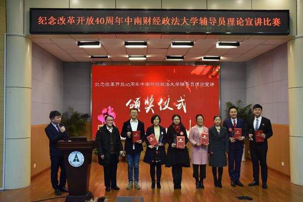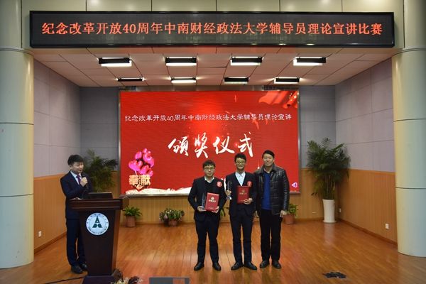 新闻网讯(学生通讯员 廖慧)12月13日,由党委宣传部、学生工作部、党委研究生工作部主办的“庆祝改革开放40周年”辅导员理论宣讲比赛在文潭楼一楼报告厅成功举办。校党委王文贵副书记莅临活动现场。来自各学院共19名一线专职辅导员参加比赛,活动由中国大学生在线通过微博全程直播。经过激烈角逐,新闻与文化传播学院辅导员杨兴永和刑事司法学院辅导员卓张鹏荣获一等奖。