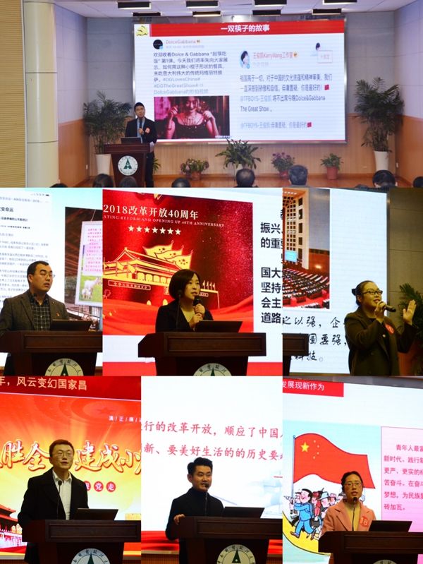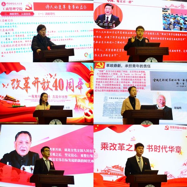 新闻与文化传播学院杨兴永老师用扎实的理论知识和网言网语回应了学生关于改革开放以来“共同富裕”问题的关切,既有理论高度,又有实践深度,更有感情温度,引得满堂喝彩。刑事司法学院卓张鹏老师结合学校70年校庆,讲述了改革开放以来的中南大故事,用身边人讲述身边事,用身边事教育身边人,引发现场师生强烈共鸣。中韩新媒体学院赵颖老师从“1”至“9”带领大家回顾了改革开放以来取得的辉煌成就:高铁总里程全世界第一、世界第一大出口国;经济体量世界第二;世界经济增长贡献率超过30%;全党牢固树立起了四个意识、坚定了四个自信;“五位一体”统筹推进;人均国内生产总值近六万元;七亿多人摆脱绝对贫困;农村居民收入增长连续八年快于城镇居民;社会养老保险覆盖九亿多人。法学院司志莲老师以“从‘见字如面’到‘天涯咫尺’”为题,从40年通讯工具变迁切入回味中国科技崛起的光辉历程,从书信到电报,从BP机到汉字寻呼机,从大哥大到智能手机,这些通讯工具的更新换代见证了中国科技实力的提升。中韩新媒体学院刘祚衡老师以中南大毕业生照片为切入,阐述了不同时期中南大学生的衣、食、住、行、用、学等方方面面的变化,以小见大,展现了改革开放以来中国社会发生的巨大变化。统计与数学学院艾合买提·吐尔地老师以自身故事为切入,分享了发生在他身上的学校募集善款帮助解决难关、参军报国、扶贫资金助力养殖场建设等故事,展现了改革开放以来各民族在中国共产党的领导下团结一致建设美丽新疆的和谐画卷。