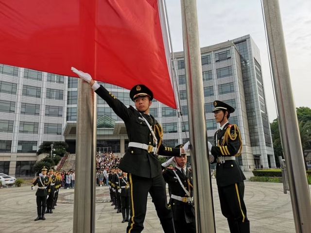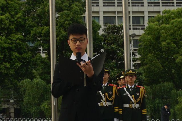 5月5日上午七点十分,当一切准备就绪后,全场安静下来,国旗护卫队成员迈着铿锵有力的步伐来到国旗台下。随后,雄伟庄严的国歌响起,升旗手振臂一挥,鲜艳的五星红旗缓缓升起,随风飘扬,全体师生肃立注目、奏唱国歌。