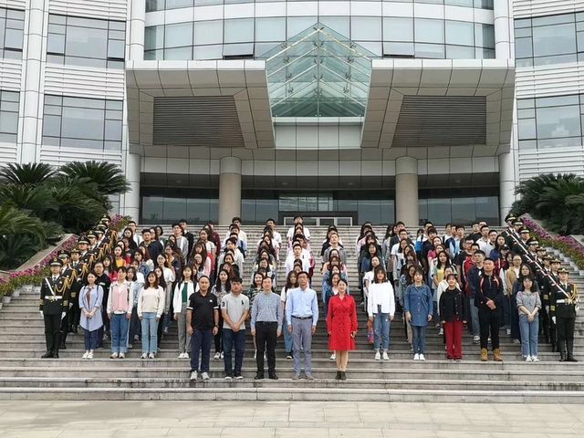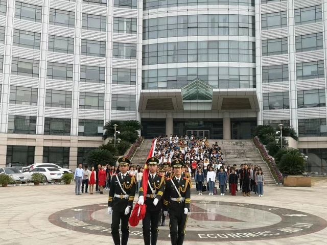 升旗仪式正式结束后,财政税务学院师生代表与国旗护卫队成员在中原楼前合影。