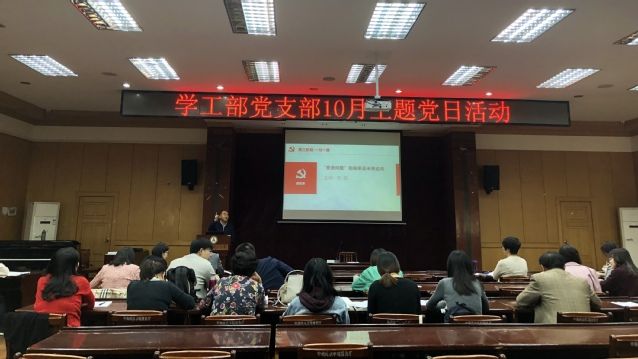 (通讯员 刘璐 谢吉)10月18日上午,学工部党支部在文潭楼四楼报告厅开展了十月支部主题党日活动,应到30人,实到29人,1名老师因上课请假。本次活动由支部副书记左思主持。