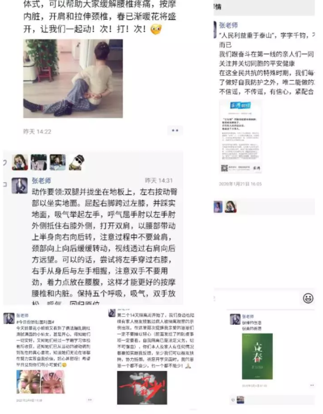 通过每日线上平安日报、发布各类疫情提示、引导学生在家自学,通过公众号、朋友圈安抚学生面对疫情复杂情绪、推出战“疫”云家访、瑜伽健身云打卡等形式保持战斗状态。在推行“战疫云家访”中,我通过每日与学生线上视频面对面的方式实时掌握大家在家防疫状况,关注每一个家庭的平安健康、每个学生的学习生活。同时,我还在朋友圈中与师生、家长分享瑜伽健身动作,以线上云打卡的方式,缓解大家自行隔离在家的焦虑情绪,怡性健体,用别样的方式在疫情战役中时刻陪伴在大家身边。