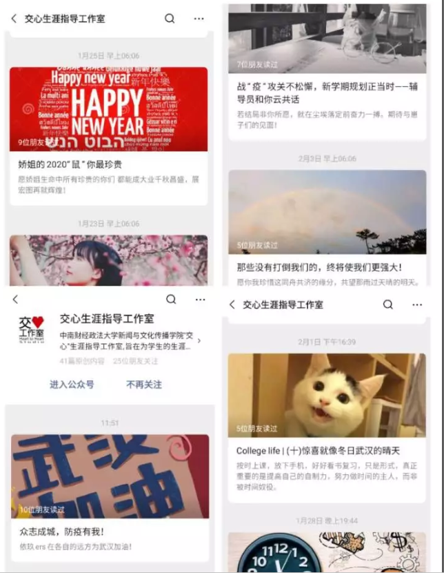 与此同时,我也加大了工作室公众号的推文频率和力度,《想不想放假回家不被嫌弃?》《专治“假期综合症”》《李子柒家里的中国风,我们都有》《延迟开学不等于延迟时间管理》《那些没有打倒我们的,终将使我们更强大》《战疫攻关不松懈,新学期规划正当时——辅导员与你云共话》等一篇又一篇的推文,为学生提供在家战“疫”的正确打开方式和自我提升的途径……在“致敬所有逆行”加油短片中,学生们表达了心中对武汉的牵挂,他们将祝福献给武汉,献给祖国,传达出“众志成城,防疫有我”的坚定心声。