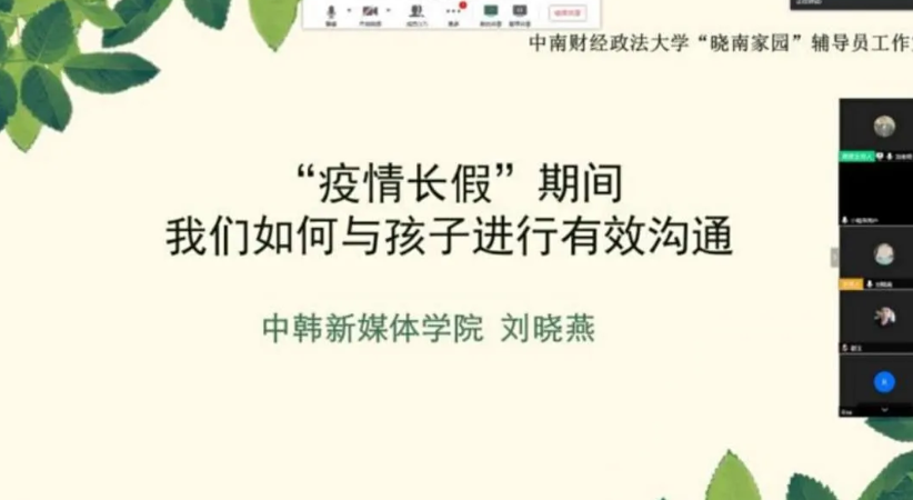 3月25日晚8点,中韩新媒体学院党委副书记刘晓燕围绕“疫情长假中如何与孩子高效沟通”这一话题,与100余名家长在“腾讯会议”平台上展开了沟通互动。刘晓燕以和孩子相处中酸甜苦辣的事例切题,从“依恋的研究”、“情绪的流动”、“沟通的技巧”等三方面视角,系统阐述了亲子间情感培养与沟通技巧。