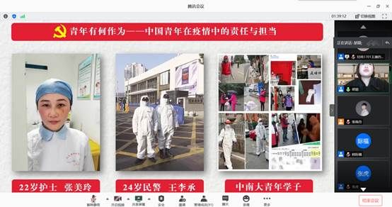 信科1701班的王康领学习近平总书记关于疫情的重要讲话精神,并借助短视频等新媒体手段对民法典的实施意义及《2020年政府工作报告》进行了生动的解读。信科1701班的李静通过诵读原文领学了习近平总书记给北京大学援鄂医疗队全体“90 后”党员的回信和五四寄语精神,分享了自己的学习感悟。