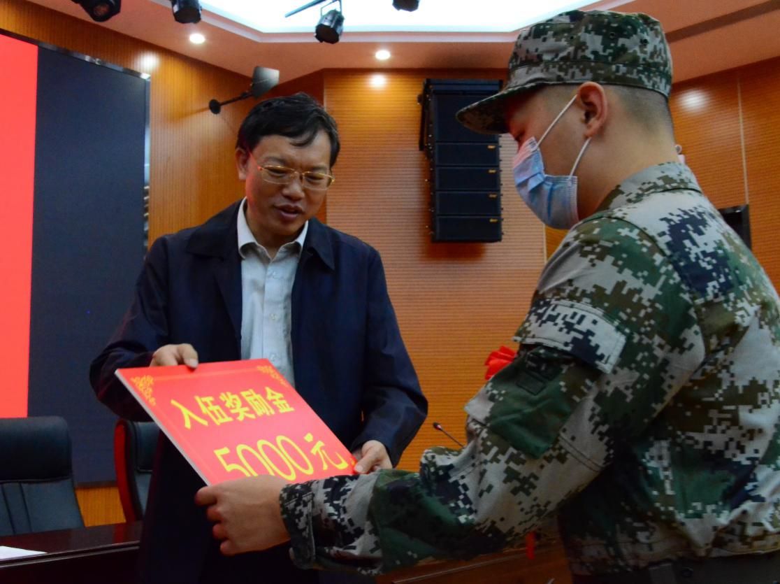 为鼓励同学们参军入伍,学校为每位同学准备了5000元奖金及纪念品,由覃红为入伍新兵颁发奖金及纪念品。