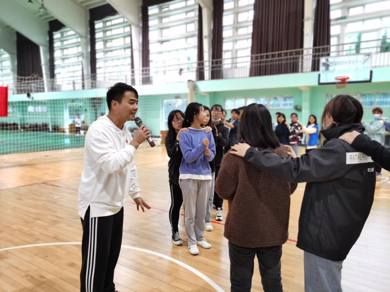 随后,在郭青川的组织下,全体心理委员们开展了“贪吃蛇”热身小游戏,通过猜拳的方式调动大家的积极性,最终在欢声笑语中围成一个大圆。紧接着,伴随着郭青川的示范,同学们开始了“花开花落”破冰游戏。在此活动中,同学们相互搭肩,在“花开”“花落”“风吹”“草动”等口令的指挥下做出相应的动作。在热身与破冰活动结束后,现场气氛也随即达到高潮,同学们之间的配合能力和协调默契也得到了提升。