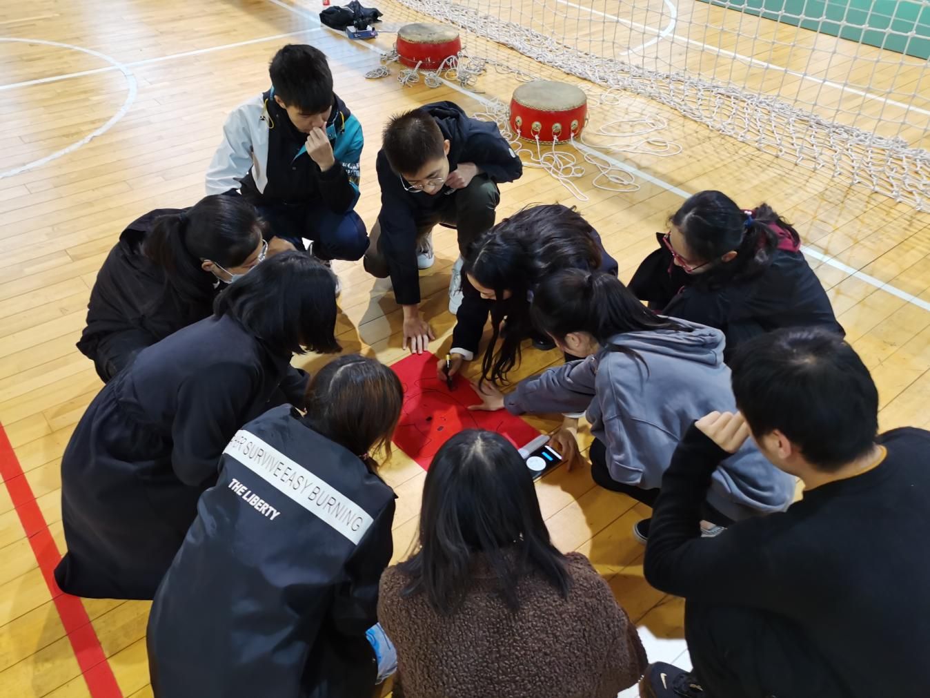 最激动人心的缓环节则是“鼓动人心”挑战赛,十个心理委员小组被分为两大组序,分别展开训练与比赛。在激烈的赛程中,各小组成员手持牵拉绳撑起鼓面,在3分钟以内计数颠球次数,以颠球多者为胜。各小组谨慎配合、通力协作,观众们也高声呐喊、加油打气,现场氛围既紧张又刺激。在这场比赛中,各小组的同学对彼此的印象都更加深刻,加深了同学们的感情,更凝聚了心委们的力量。