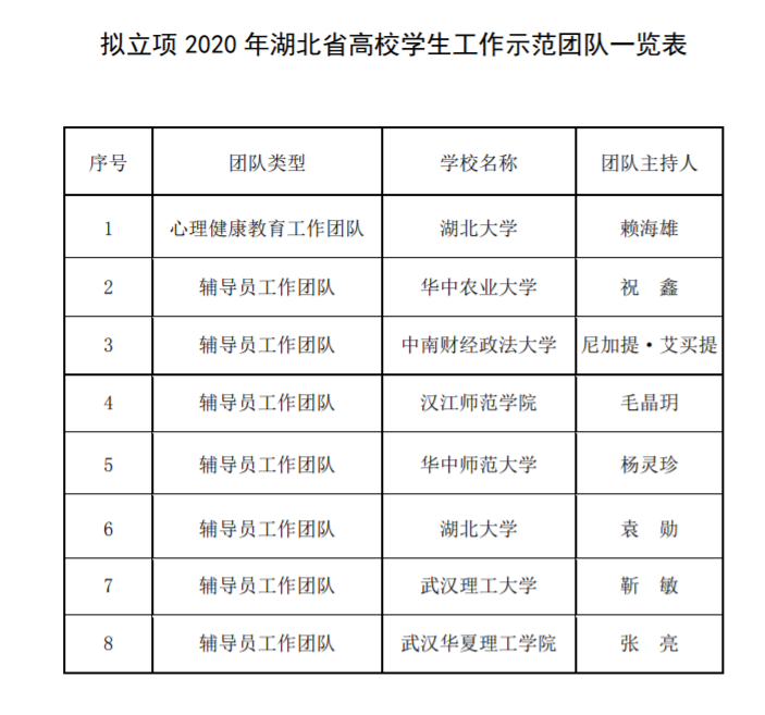 关于拟立项2020年湖北省高校学生工作示范团队的公示: