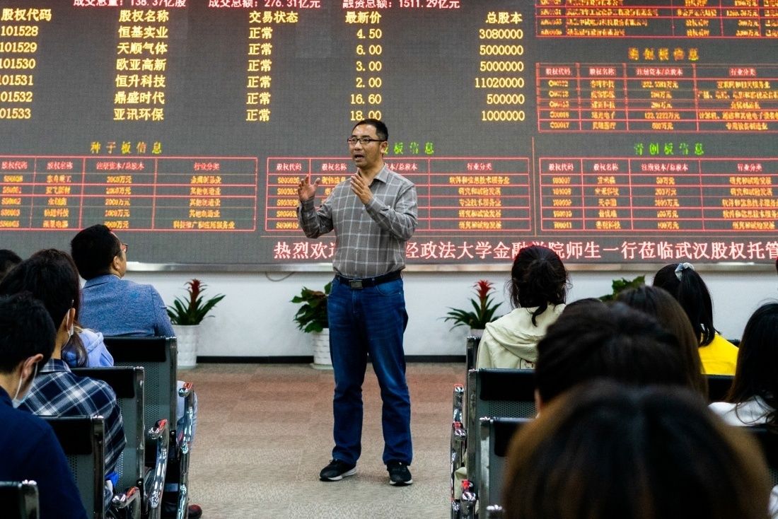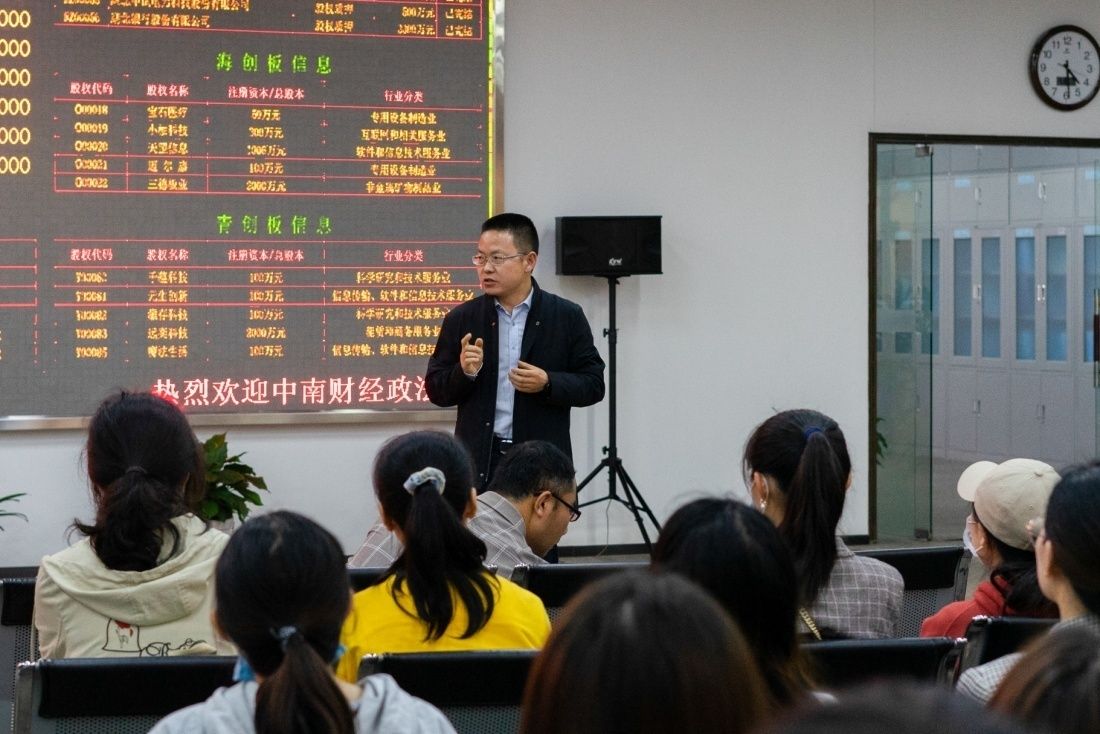 在交易大厅,投资银行部项目经理汪洋为同学们介绍了武汉股权交易中心的市场定位和各项业务功能。作为湖北省区域性股权市场,中心聚焦省内中小微企业私募股权市场,为企业融资、发展、上市提供服务。在该定位的指导下,中心设股份公司板、科技板、青创板、海创板、种子板,按照企业不同的性质在不同的板块挂牌,有针对性地对企业提供各种服务。除此以外,汪经理还从中心服务模式的创新角度出发,介绍了中心两大子平台“湖北资本市场学院”和“四板优品会”,分别为企业经营融智和产品展示提供有效途径。