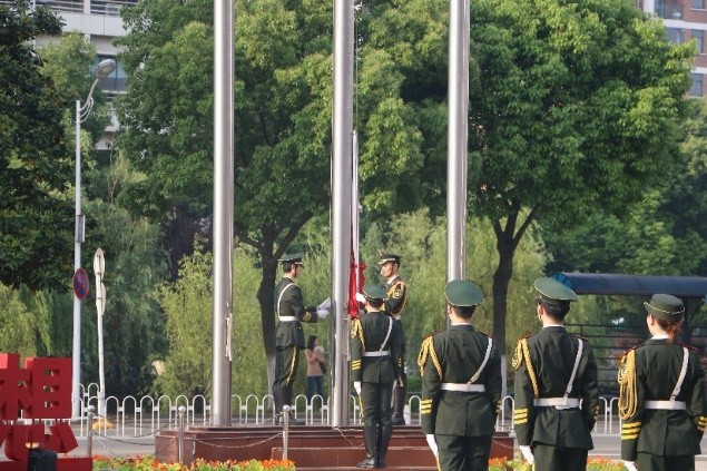 七点整,着装整齐的国旗护卫队在清晨第一缕阳光下向中原楼广场走来。他们步伐铿锵,英姿飒爽,肩负国旗,自信盎然。全体师生肃穆而立,齐唱国歌,注视着五星红旗冉冉升起。