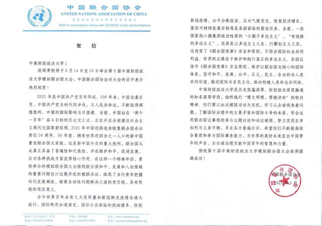 作为华中地区最具影响力的模联会议,此次大会收到了中国联合国协会发来的贺信。在贺信中,中国联合国协会高度赞扬了学校举办此次大会的意义,体现了当代青年把握时代发展潮流、探索全球性问题解决之道的责任感,希望与会代表不断提高综合素质和参与国际事务能力,为世界的美好未来发出中国青年的声音,为全球治理贡献中国青年的智慧和力量。