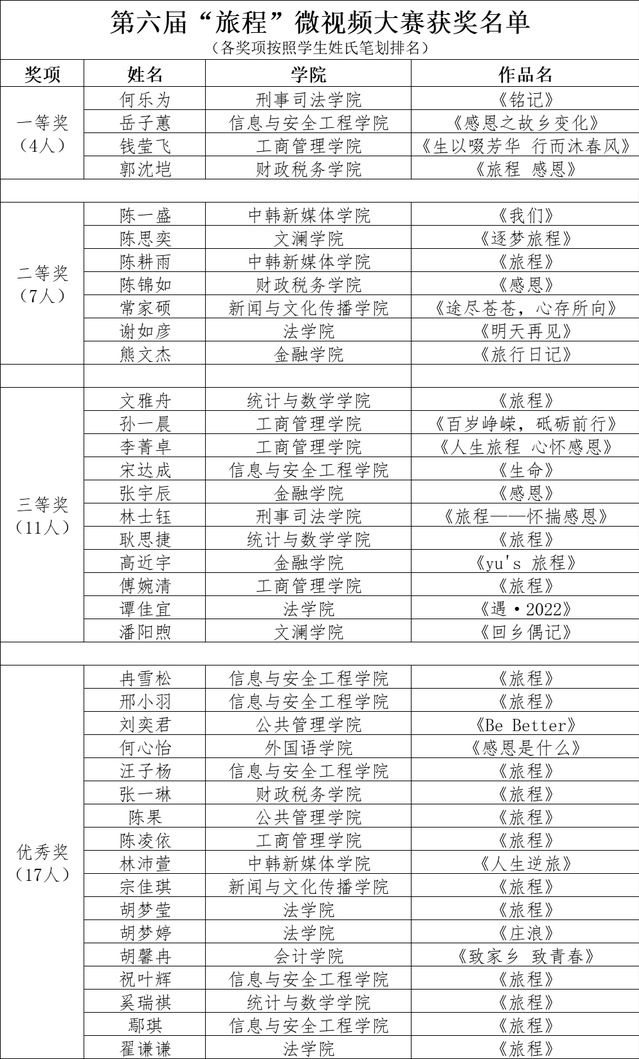 第六届“旅程”微视频大赛的评选工作均已结束,本次大赛收到来自13个学院的2022级本科新生的视频作品,经个人申报,学校专家评审,学校决定对获奖作品进行表彰,获奖名单附后。