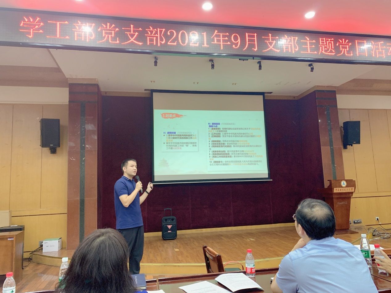 在“一月一课”学习交流环节,于苏甫江·玉山同志以《新时代铸牢中华民族共同体意识内涵浅析》为主题,从“中央民族工作会议导读”“铸牢中华民族共同体意识与我们”“铸牢中华民族共同体意识的未来展望”三个方面展开讲解,结合自身从事学校民族学生事务工作的经历,给全体党员上了一堂生动党课。