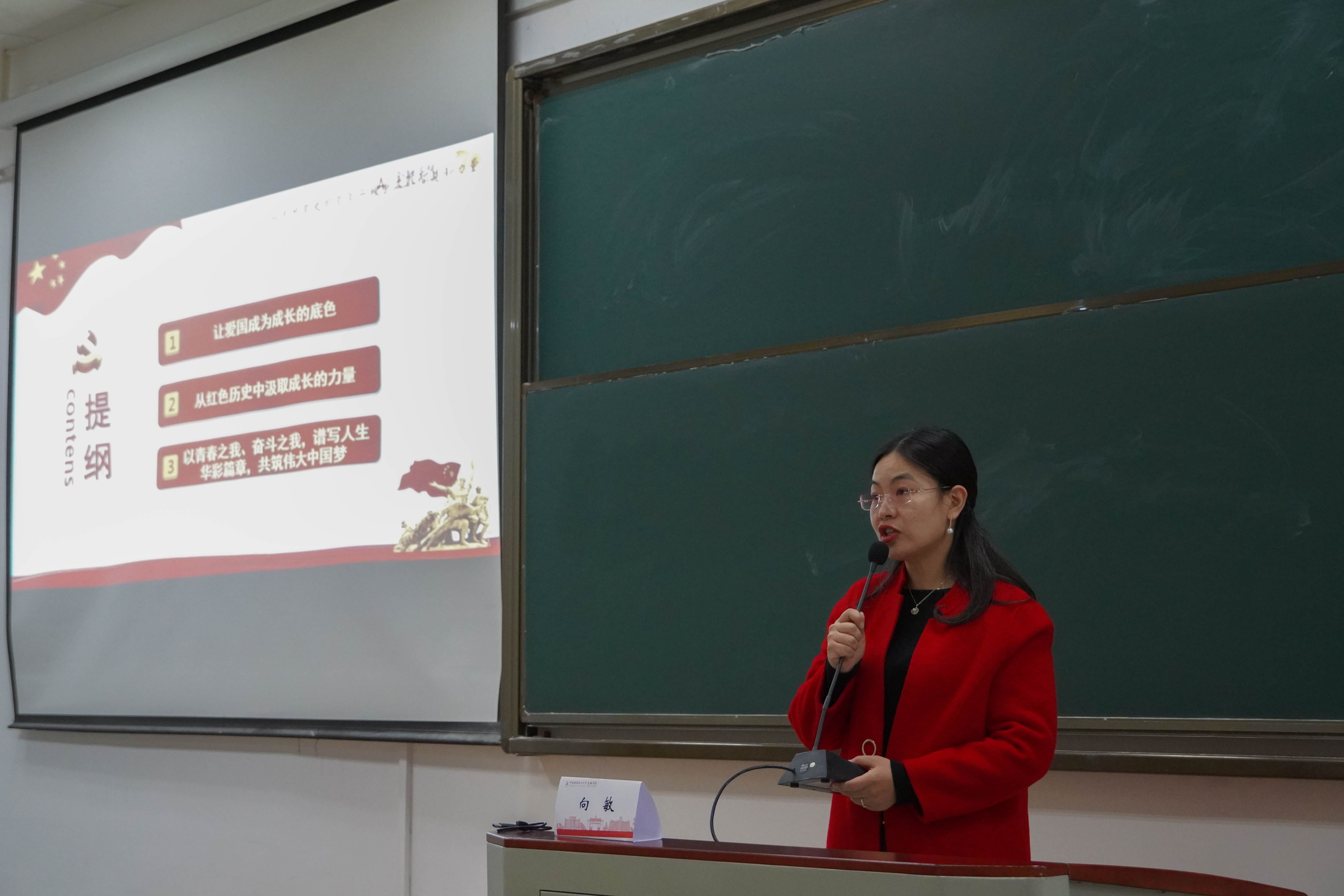 金融学院党委副书记向敏以青春奋斗之路为引,讲述了与2021级新生的五个故事,从如何与祖国共成长出发,带领同学们学习了党的百年奋斗史和中华民族从站起来到富起来到强起来的发展史,勉励全体同学要以让爱国成为成长的底色,从红色历史中汲取成长的力量,以青春之我、奋斗之我谱写人生华彩篇章。