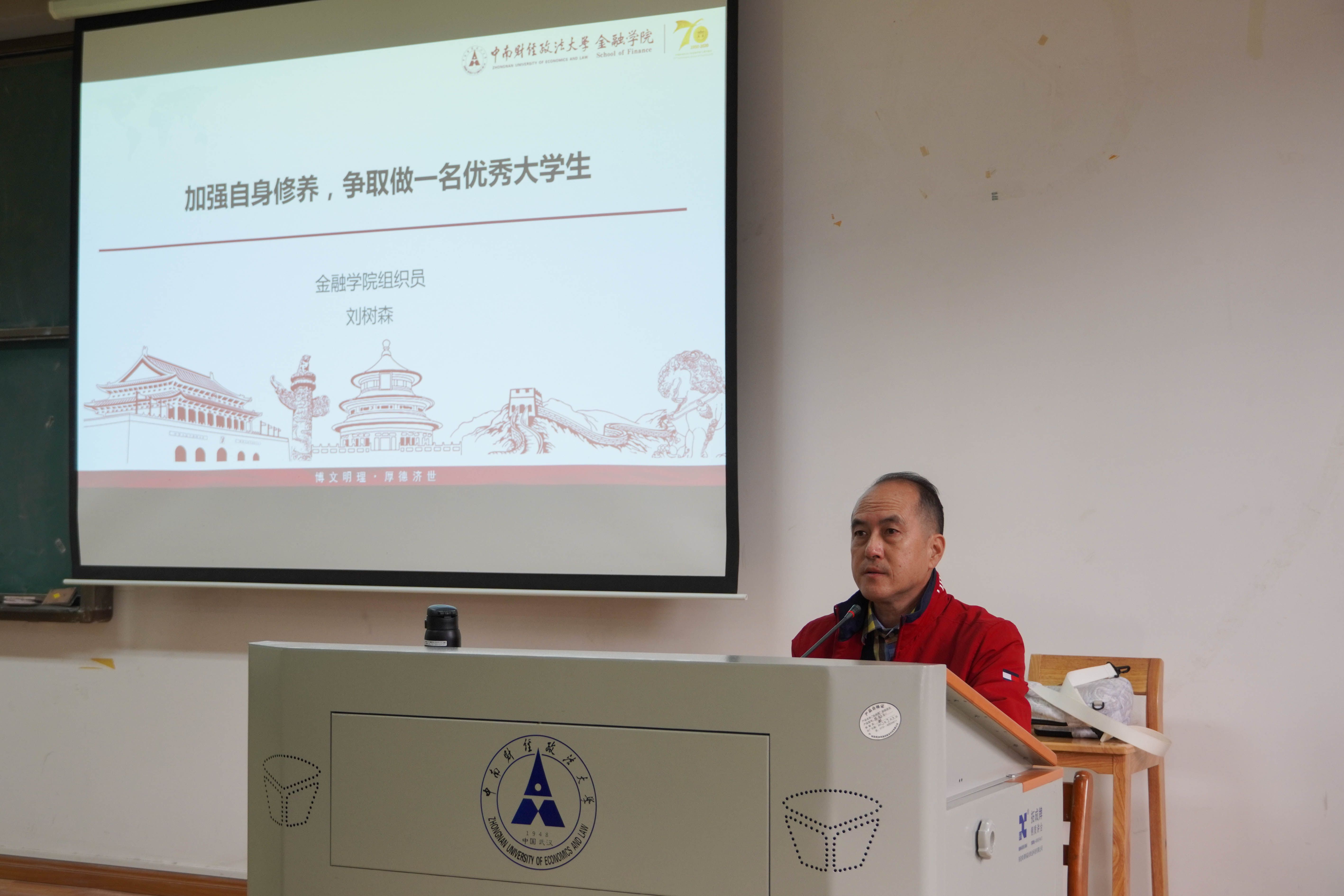 金融学院组织员刘树森以《加强自身修养,争做一名优秀的大学生》为主题进行授课,从政治信仰、奋斗目标、专业学习、人际关系、领导才能、工作效率六个方面为同学们介绍了如何加强自身修养,争做优秀大学生。