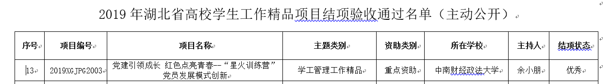 (通讯员 涂兴月)11月16日,湖北省教育厅思想政治教育与社会科学研究处发布《关于2019年湖北省高校学生工作精品项目和实践育人特色项目结项验收结果的公示》,经主持人申报、高校审核、形式审核、专家评审和综合评议等环节,我校余小朋主持的《党建引领成长 红色点亮青春--“星火训练营”党员发展模式创新》(重点资助)和马晴主持的《七秩沧桑砥砺行,奋勇共进新时代——高校学生爱国教育实践提升体系构建探析》(一般资助)两个项目验收获评优秀,龚家友主持的《情系雪域高原,关爱育人到“家”——西藏少数民族学生家访实践活动》(一般资助)和聂飒主持的《“启承转合”式高校创新创业教育生态系统构建研究》(一般资助)两个项目验收合格。