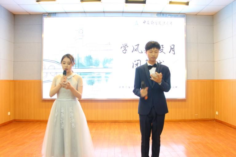 本次“优良学风班级”评选中综合得分排名第一的卓越2001班带来班级风采展示,学习委员顾静宇作为代表主讲,她用“学之染人,胜于丹春”“红色领航,德法兼备”“踵事增华,臻于至善”“春华秋实,岁物丰成”“ 终日乾乾,与时偕行”五组短语概括班级简介、思想建设、学风建设、学习成绩、科研创新五个方面,班级同学共完成201万字的案例研习报告,71%的同学加权平均成绩90分以上,大学生创新创业项目立项通过率高达30%,博文杯项目立项通过率高达40%……丰硕班级成果获在场观众阵阵掌声。