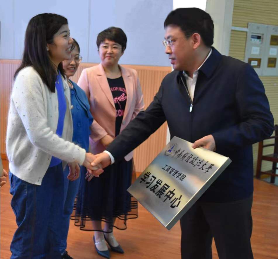 覃红、刘仁山、李志生为学校确定培育的第一批院级学习发展中心院授牌,会场气氛热烈,掌声雷动。