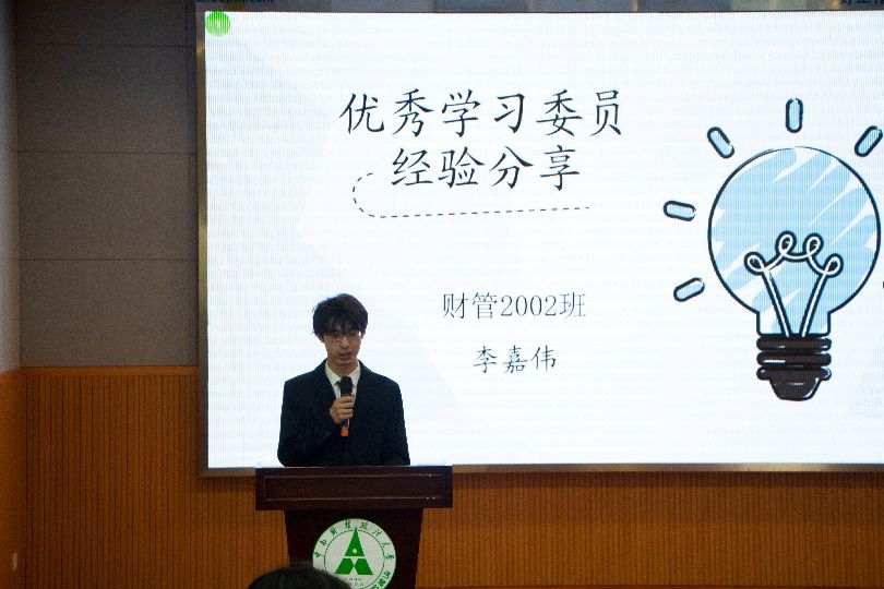 财管2002班学习委员李嘉伟代表“优秀学习委员”做经验分享,他分享了自己作为学习委员的工作经验和心路历程,“每周五整理出本周所有科目的作业”“软磨硬泡终于把全班同学凑到了教室进行期中检测”“固定在文津404带领全班同学自习”……说起自己的工作经历,李嘉伟满脸幸福。他说,他只是众多学习委员中的一员,大家共同坚守岗位,默默奉献。在李嘉伟的引导下,由郝书玉、李天聪、陈宗杰等同学组成的学习委员代表团走上舞台,用歌曲《我乘着风飞过来》唱出学习委员的奋斗和理想。