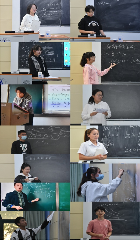 13位同学以数学、经济学相关科目知识展开试讲,知识点涉及“函数项级数幂级数的相关问题”“无穷级数”“积分法”“三重积分的解法”“变速极限运动”“边际替代率”等。同学们准备充分、声音洪亮、自信从容,通过板书、图文结合、理论与实例结合、对比解题等多种方法对知识点进行讲解。
