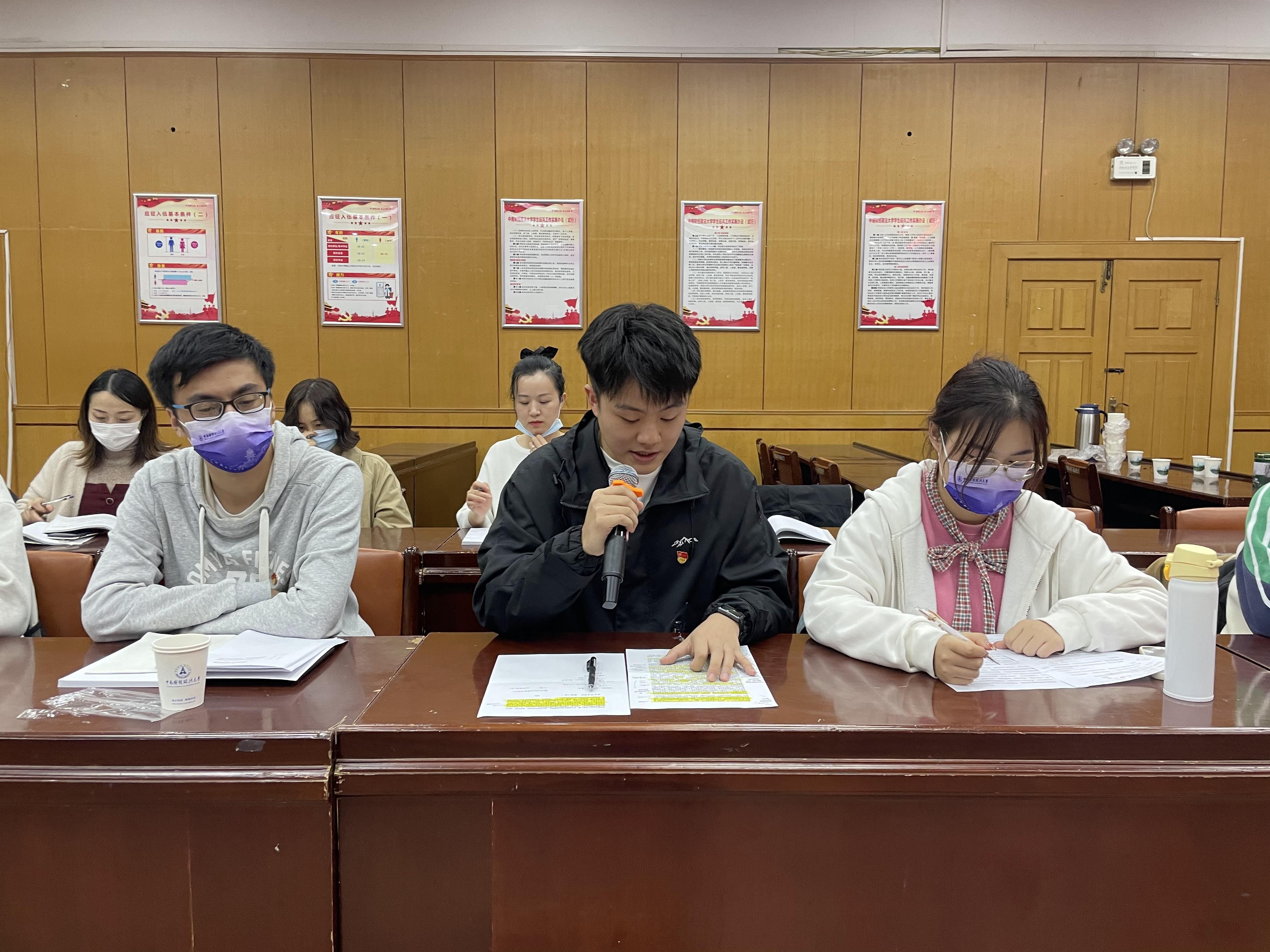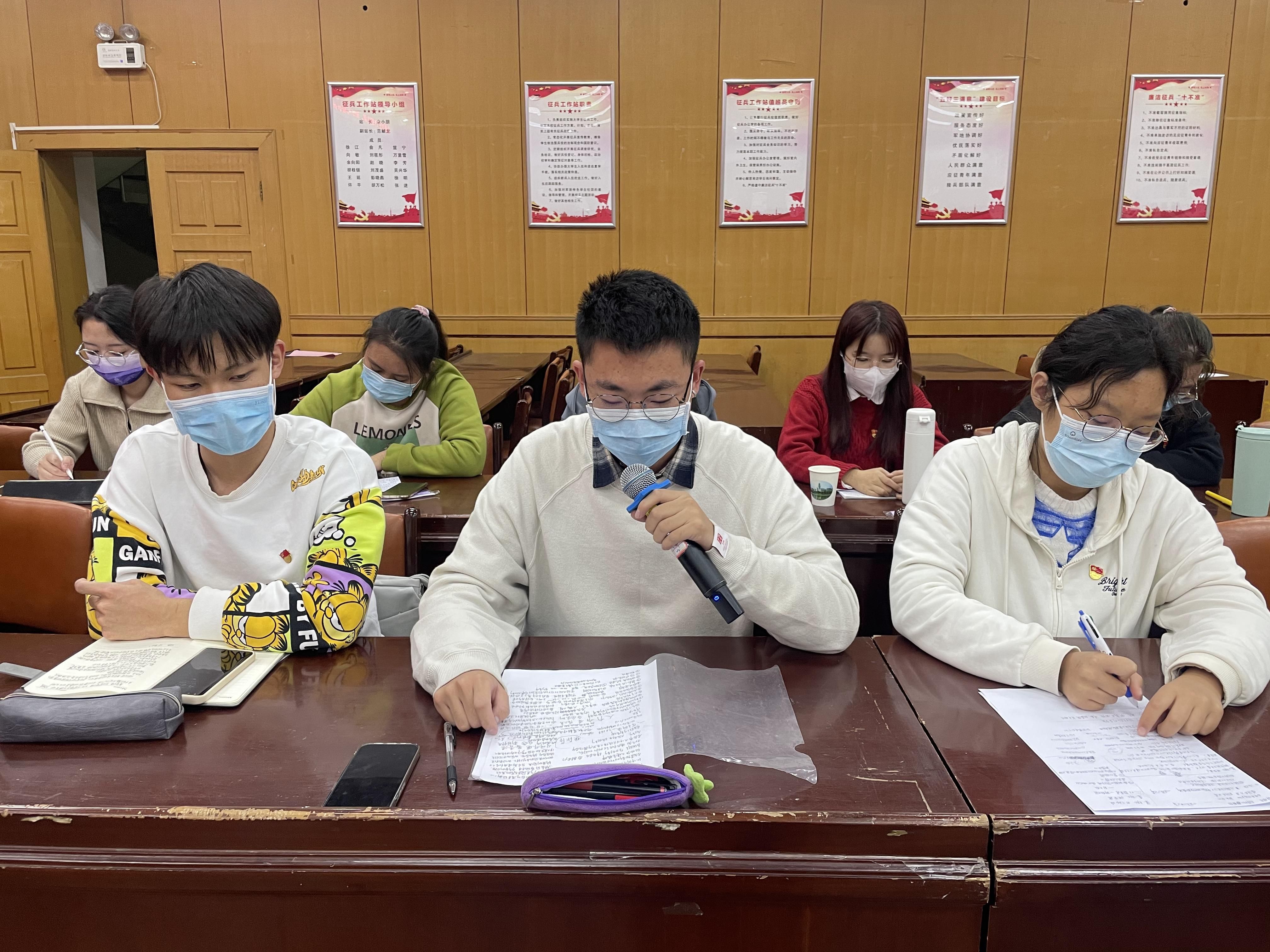 在学习研讨环节,师生代表分享了各自不同的心得体会。在学习研讨环节,谢吉同志、舒鑫才同志和学生党员刘嘉、赵茹骁踊跃发言,他们立足学科专业、岗位职责、工作实际,围绕习近平总书记向党的二十大所作的报告,深入开展专题学习讨论,分享了各自不同的心得体会。