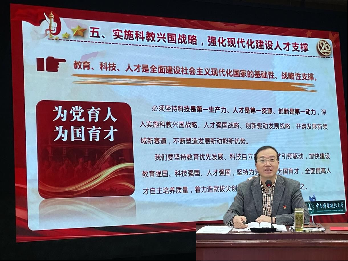 覃红同志为大家讲授了题为《中国式现代化对大学生思想政治工作提出的新要求》的专题党课。他先从四个“新”——新境界、新使命、新使命、新选择着手,结合二十大报告中中国式现代化的要求,阐述了什么是中国式现代化。通过回顾华夏五千年的文明进程,尤其是中国近现代发展史,覃红详细讲述了习近平《治国理政(第四卷)》中有关中国式现代化五个基本特征的内涵——人口规模巨大、全体人民共同富裕、物质文明与精神文明相协调、人与自然和谐共生、走和平发展道路。覃红强调中国式现代化对大学生思政工作提出的新要求,一是要高质量落实“立德树人”根本任务;二是要用习近平新时代中国特色社会主义思想武装学生;三是引导广大学生广泛践行社会主义核心价值观,希望广大学生工作者严格按照新要求,做好大学生思政工作。
