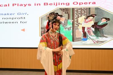 为了让大家能够直观地感受传统艺术的魅力,活动邀请3位京剧社的同学现场表演,3位同学分别展示了京剧经典曲目《定军山》《西厢记》和《锁麟囊》的经典选段,华美的装扮、精彩的表演引得在场观众不断喝彩。