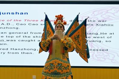 “来来来,带过爷的马能行,我要把定军山一扫平!”“Huang Zhong,a veteran general from Shu, defeated Zhang He at Mt Tiandang,and captured the top of the shield mountain to the west of Dingjun Mountain.”11月16日下午,首义校区31号楼多功能厅内,一场京剧与英语的精彩碰撞引人入胜,这是“问学典籍”第三期暨“用英语讲中国故事”活动启动仪式的活动现场。学校党委常委、副校长覃红教授,新航道武汉学校副校长毛国化,新航道光谷校区&枫叶校区分校长徐佩及相关领导老师出席活动。外国语学院2022级新生代表、各学院港澳台学生代表现场参与学习。