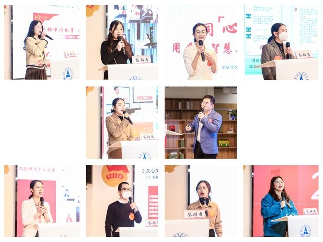 其中,金融学院穆帆强化学生思想引领主线、筑牢学生安全稳定底线、延拓学生全面发展环线、竞逐思想政治工作一线,用“四根线”画好立德树人的“同心圆”;法学院杨茹“主动标签化”,用信仰管理服务引领青年,“积极去标签化”,用真清温情热情感召学生,与学生共同成长蜕变;新闻与文化传播学院孙林红春风化雨陪伴学生成长,教学相长争做学生榜样,以价值引领育出彩时代新人,用耐心守护为学生保驾护航;哲学院毛丹丹丹心一片育桃李,十年深耕哲院一线,陪伴青年学生成长成才,见证七届毕业生从入学到毕业的蜕变;法学院徐金花初心笃定,始终热爱,把小个子蕴含的大能量释放给每一位学生,努力成为新时代大学生的人生导师;外国语学院张冉将家国情怀融入工作之中,用外语讲好中国故事,始终践行做有理想、有本领、有担当的新时代辅导员的初心使命;金融学院王秀景能共情有温度、肯吃苦有干劲、含热情有担当,潜心做好铸魂育人工作,用爱与智慧与学生共成长;文澜学院刘千惠始终坚持立德树人的工作中心和三全育人的工作要求,用“四个坚持”促进全面发展,“五育并举”培养优秀人才;法律硕士教育中心刘翔用心走进学生,用爱陪伴成长,努力做研究生政治思想引领者、成长成才助力者、健康安全守护者和前进路上支持者;中韩新媒体学院黄祯辉努力做学生思想“引路人”、成长“同路人”和前行“开路人”,为热爱矢志不渝,用情链接育人梦和学生成才梦。参赛选手用爱搭桥、用心传递、用情诉说,以自己的亲历亲见亲为,讲述了一个个感人至深的一线故事,展现了新时代高校辅导员的使命与担当。