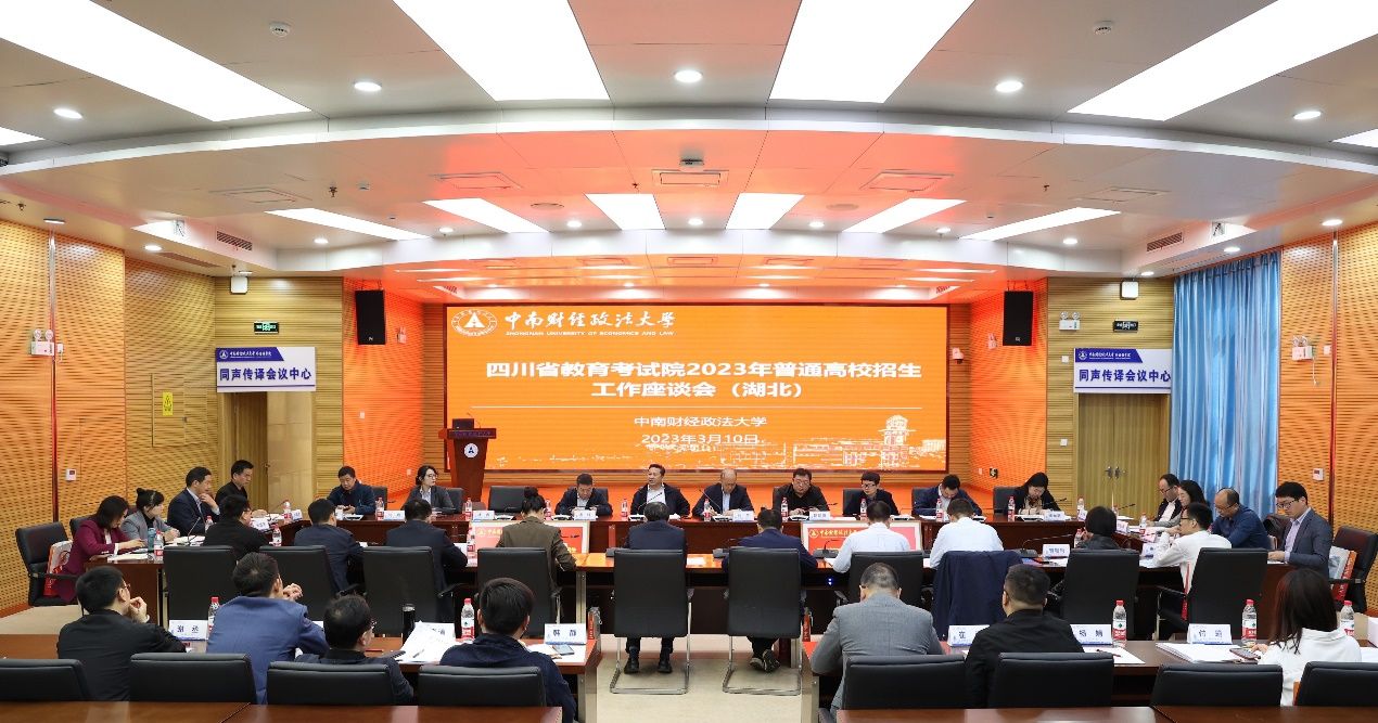 (记者 穆帆 摄影 李赢)3月10日上午,四川省教育考试院党委委员、副院长张刚一行来访我校,并于文澴楼同声传译国际会议室召开2023年湖北普通高校招生工作座谈会。校党委常委、副校长覃红参加座谈会。武汉大学、华中科技大学、中国地质大学(武汉)、武汉理工大学、华中农业大学、华中师范大学、武汉科技大学、长江大学、武汉工程大学、武汉纺织大学、武汉轻工大学、湖北工业大学、湖北中医药大学、湖北大学、湖北师范大学、湖北民族大学、中南民族大学、江汉大学、三峡大学等高校招生工作负责人以及党委学生工作部副部长兼人民武装部副部长范献龙围绕人才培养与人才选拔进行探讨和交流。四川省招生考试指导中心主任刘平主持座谈会。