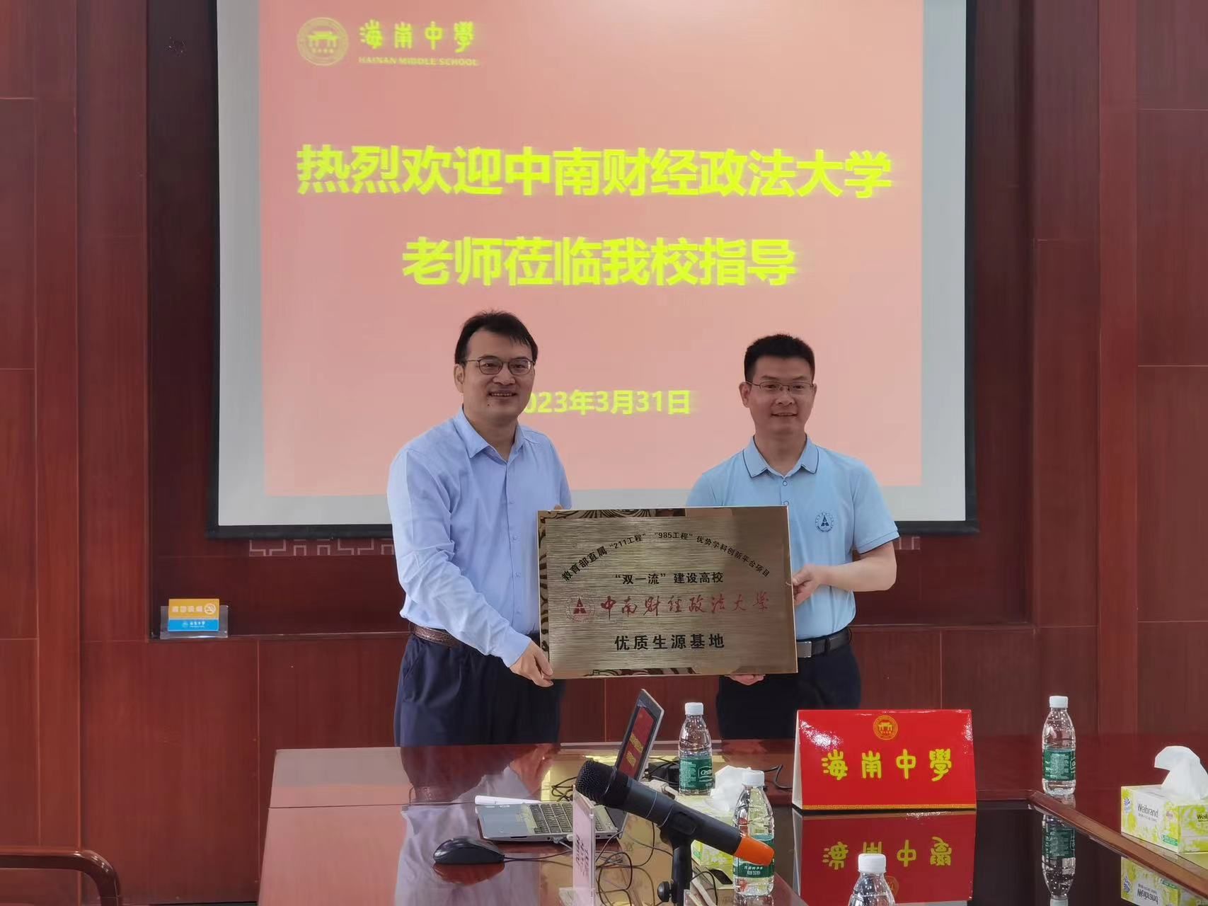 李司铎前往海口一中,与学校教务处主任黄志林及高三年级班主任代表进行了座谈和交流,代表学校授予海口一中“优质生源基地”牌,宣传了我校“融通型”人才培养特色及法学学科、专业、学生升学就业等情况,帮助海口一中的老师充分认识和了解我校。