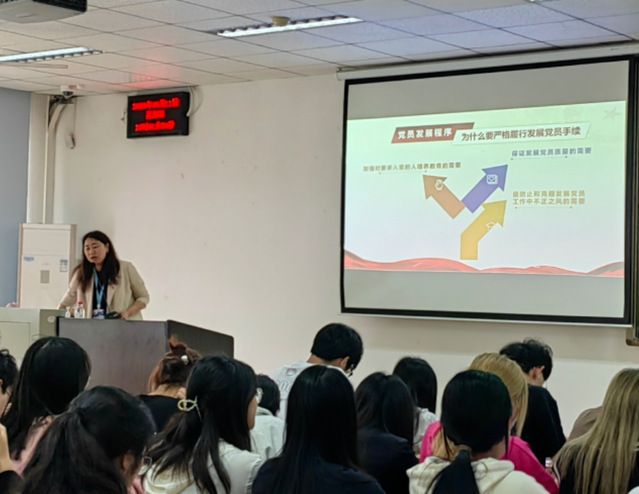 刘晓燕向同学们展示了党员发展程序与要求,从正确理解发展党员工作的总要求、严格履行发展党员手续、常用入党文书写作规范入党程序的制度依据和流程详解等多个方面进行说明。同时向同学们展示了关于焦裕禄同志的三份感情真挚的入党申请书,并从大学生入党积极分子的角度,给了大家很多切实的学习建议。