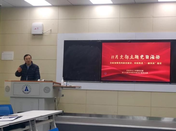 (通讯员 谢吉)11月29日上午,围绕主题“全面加强党的政治建设,持续推进‘一融双高’建设”,党委学生工作部党支部、统计与数学学院本科2021级党支部在文波楼108智慧教室联合开展11月支部主题党日活动。党委学生工作部部长余小朋、统计与数学学院党委书记梁娜及四十余名师生党员共同参加,活动由党委学生工作部第二党小组组长谢吉主持。