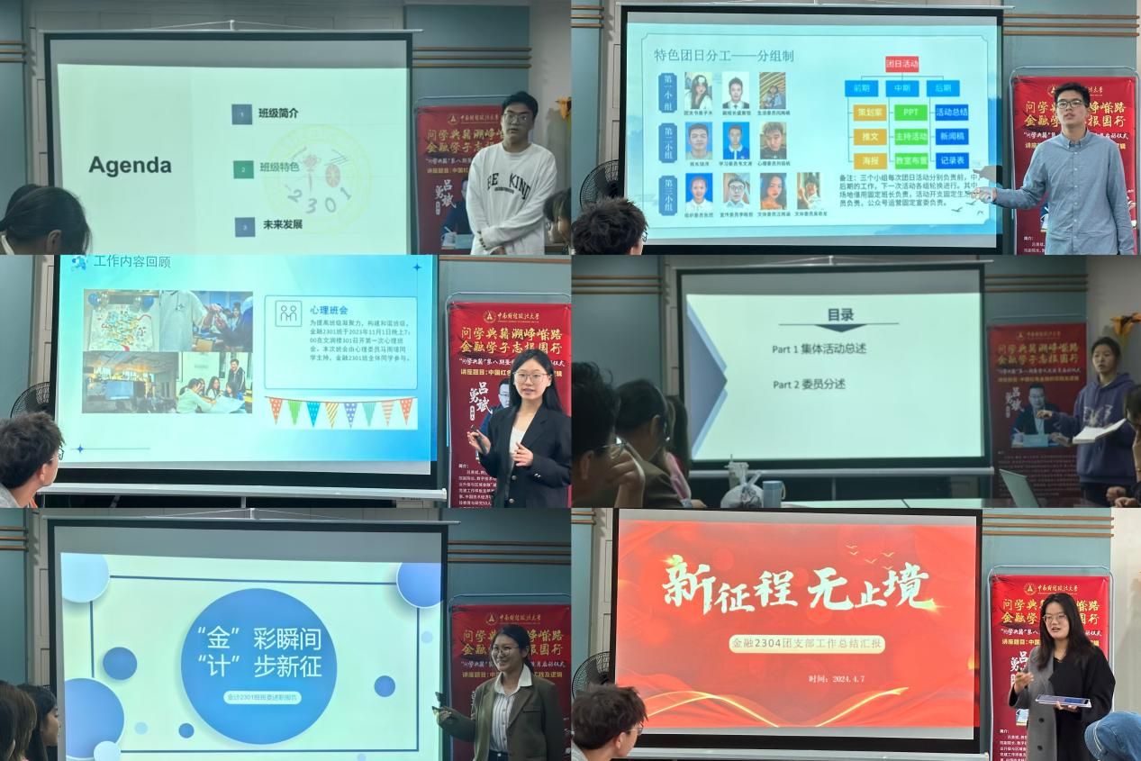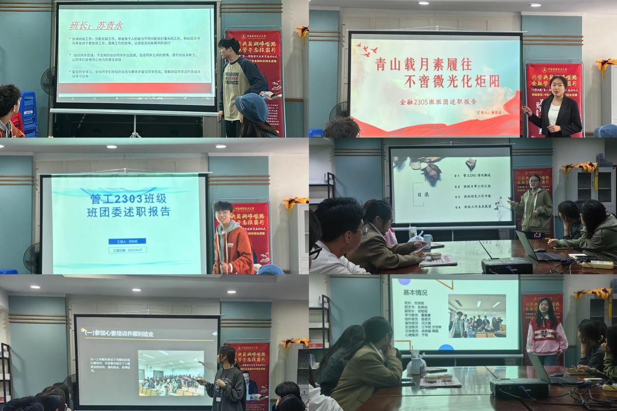 保精2301班班长杜尚义提到本班将“班团一体化”作为其特色、核心工作,通过“思想领航”“学风建设”“班团共进”“志愿同行”“总结提升”五个角度全面提升团支部核心领导力量、班级整体水平,以培养学生综合素质,提升基层团组织对青年的影响力与号召力。保精2302班班长饶洋介绍到本班特色制度——分组制,将全体班委分成三个小组分别完成团日活动的前期准备、中期实行、后期总结的工作,保证工作的高效完成。金融2301班班长杜易凡提到本班班团坚持以“聆听同学们的需求”为工作准则,以“德智体美劳全面发展”为工作方向,班团干部以身作则,引领同学们做有理想、敢担当、能吃苦、肯奋斗的新时代好青年。管工2301班班长何平鸽提到本班班级活动以爱国教育为根本,以服务同学为准则,积极为支部成员创造班风、学风双线并行的优良氛围,以活力团支部为目标,让支部成员在集体中获得幸福感、价值感。金计2301班班长姚喆围绕德智体美劳五个方面,阐述了本班铸牢党团链条,培育时代新人;大力推动学风建设,培养智育英才;锤炼体育精神,铸就强健体魄;弘扬美育精神,构建美育格局;践行劳动美德,以打造全面发展的特色班级为目标,书写独属于金计人的青春华章。金融2304班团支书赵涵颖讲到,本班始终紧抓思想建设和学风建设,高质量完成青年大学习,组织班级内部进行高数自测,通过组织丰富多彩的活动,培养同学们成为社会主义核心价值观的坚定信仰者、前沿知识的积极学习者、社会责任的主动承担者、文化自信的传播者和健康生活的实践者!