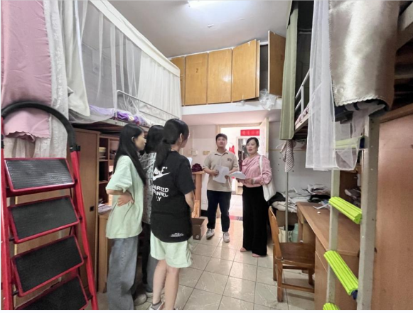 徐惠荣和江永鑫对于部分宿舍存在的脏、乱、差等卫生问题进行教育引导,并督促相关问题宿舍进行整改。