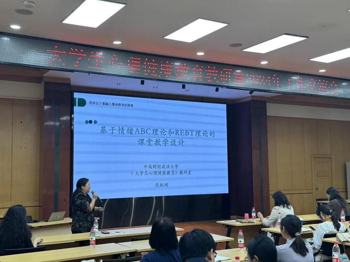 大学生心理健康教育教研室兼职教师范纯琍教授以《将学生个案融入集体教学的探索——基于情绪ABC理论和REBT理论的课堂教学设计》为题进行分享。她根据自己多年的授课经验,介绍了基于情绪ABC理论和REBT理论的课堂教学设计,指出该课程要引导将学生的个人经历与理论知识结合起来,学会运用心理学理论与方法调节情绪。