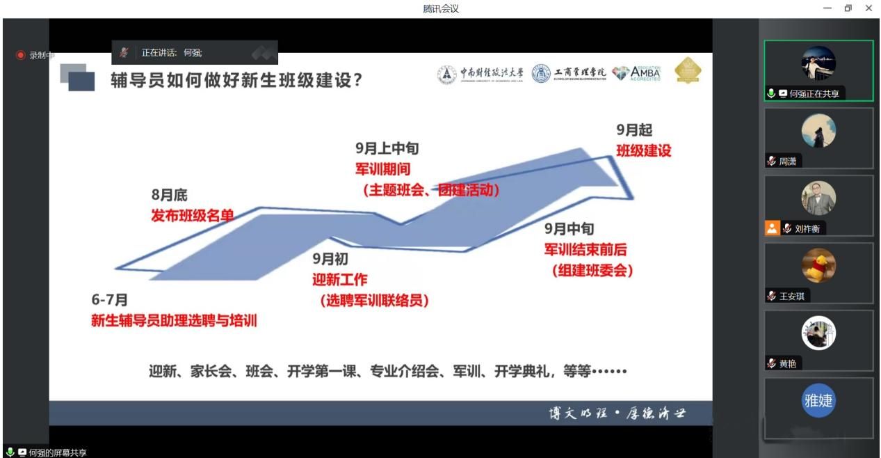 本次培训分为7个专题,从迎新工作、资助业务、生涯辅导、校园文化、党团班级建设等方面依次展开。党委学生工作部学生事务管理办公室主任谢吉逐项介绍新生报到流程、迎新工作安排、迎新注意事项、学籍管理重点以及新生档案管理等相关内容,号召全员全过程全方位做好新生入学保障工作。系统工程师作网上自助迎新平台操作演示。