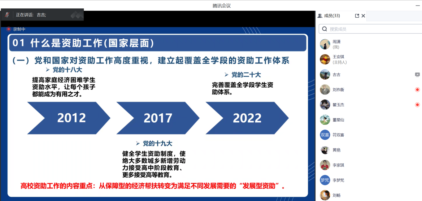 党委学生工作部学生资助管理中心办公室主任潘喆作题为《新时期资助工作的三问三答》主题分享。她从“什么是资助工作、资助谁、怎样做好资助工作”三个问题出发,帮助辅导员深入了解我校六位一体帮困助学体系。