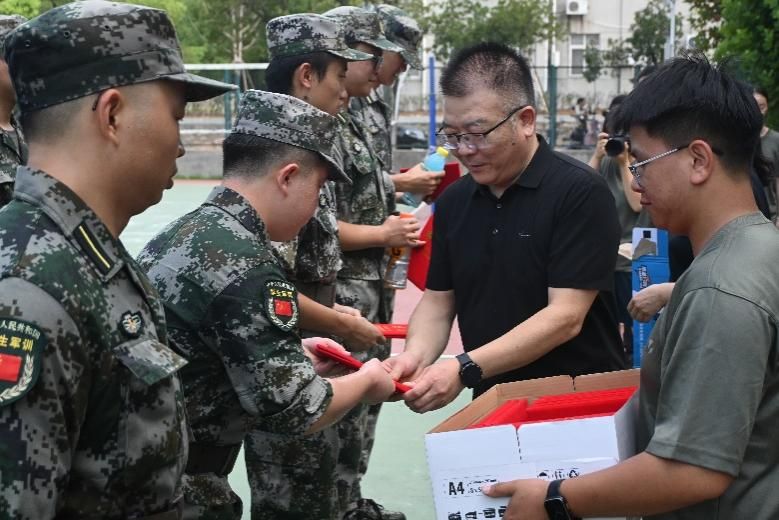 随后,王前哨、刘晓燕为军训助理颁发聘书,分发慰问品。
