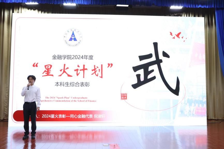 (通讯员 李奥 彭东 学生记者 段雨琦)为发挥新时代青年典范的示范引领效应,激励金融学子坚定理想信念,全面成长成才,3月20日,金融学院2024年度“三全育人”之“星火计划”本科生综合表彰大会在文泉楼报告厅隆重举行。校党委副书记陈狮,就业指导服务中心主任温习,党委组织部副部长潘常刚,党委宣传部副部长邓松,党委学生工作部副部长范献龙,校团委副书记林晶晶莅临活动现场。金融学院党委书记汪平,院长余明桂,副院长李建华、胡宏兵、吕勇斌,党委副书记朱诚蕾,学生工作办公室全体老师及400余名学生代表出席此次表彰大会。