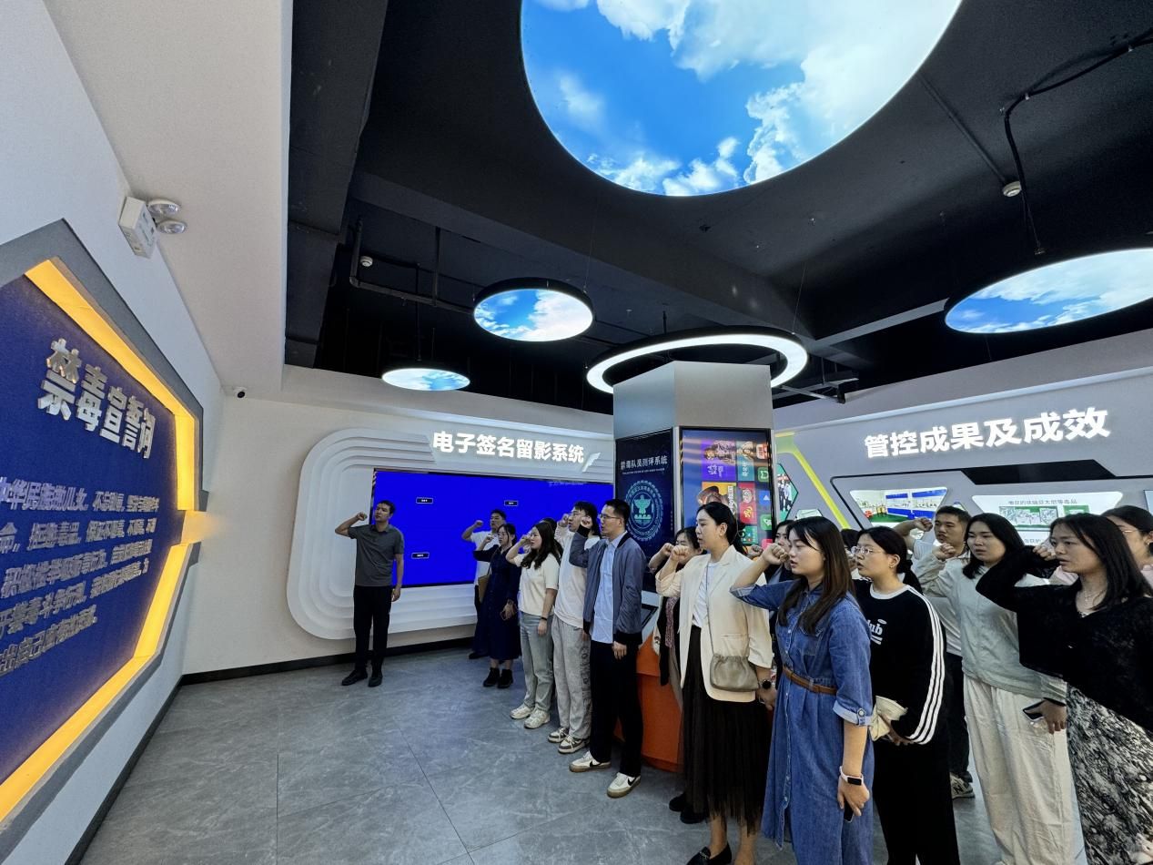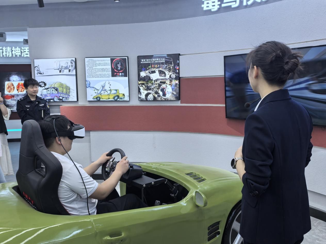 在第二站武汉光谷新精神活性物质宣教基地,讲解员系统介绍并展示了第三代毒品(新精神活性物质)的伪装形式、成瘾机制及校园防范策略,带领辅导员们参与了VR驾驶场景模拟和AI仿真模拟环节,展示了“科技+教育”在禁毒宣传中的创新应用。