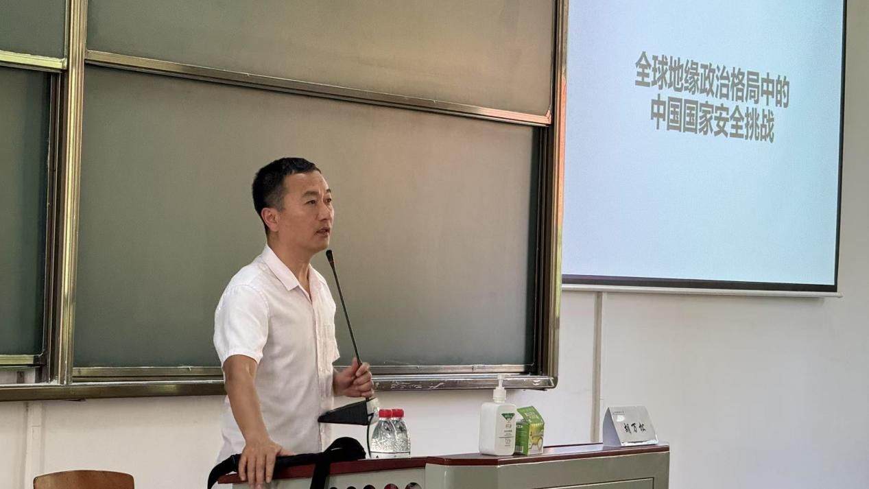 胡万松老师以《全球地缘政治格局中的中国国家安全挑战》为题,结合国际热点议题,系统分析我国面临的复杂形势,并介绍学校征兵政策和优秀典型事迹。