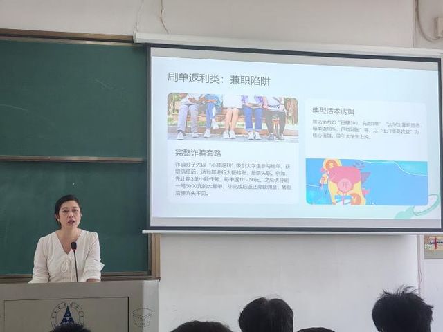 2024级本科生辅导员李荔结合校园内近期频发的诈骗案件,为同学们带来了一场生动的反诈宣传教育。她以近期网络热议的“AI换脸冒充熟人借款”“刷单返利”等典型案例为切入点,详细剖析了诈骗分子利用PS技术伪造照片、话术引诱等作案手段,揭露诈骗分子如何通过诱导受害者泄露个人信息、点击恶意链接,一步步实施诈骗的完整过程,她提醒学生要提高警惕心,不要轻易详细刷单兼职赚钱、亲朋好友突然大额借钱,叮嘱大家要时刻保持清醒头脑,筑牢反诈安全防线。随后,李荔与进安消防中心袁曈辰一起,为2024级本科生着重分析了学生宿舍、图书馆、食堂等场所易出现的消防安全隐患,展示了灭火器等常见消防器材的正确使用方法,强调了拨打校园110报警电话、消防119电话时的注意事项。