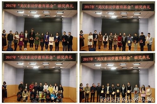 在赵家仪老师宣读2017年吴汉东法学教育基金表彰决定之后,叶建军老师、杨克明老师为陆晶晶等十位优秀本科生颁发学习优秀奖;司晓老师、黄远兵老师为杜晋国等十位本科生颁发本科生学术成果奖;姚莉教授、刘兆年老师为李光恩、谭家超等十名优秀研究生颁发研究生优秀科研成果奖;吴汉东教授为吴晓倩等十五位同学颁发学生自强基金。研究生获奖代表谭家超同学发言时,他从态度、选题方法和论文内容来介绍自己学术论文写作的经验。其中他着重指出,选题时要紧跟政治热点和社会热点,写作论文时要注重实事求是。