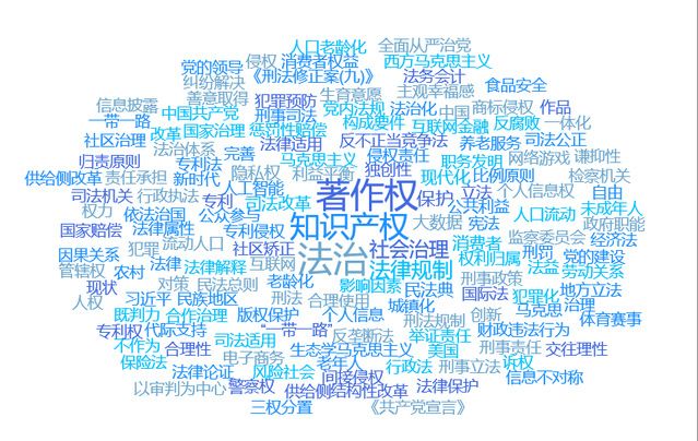 图1给出了2016-2018年米兰电竞·(中国区)法学科学研究的相关热词。可以看出,“知识产权”、“著作权”和“法治”是近三年讨论最为集中的三大主题,词频分别为40、37和29。此外,关于“社会治理”、“法律规制”和“司法改革”也是较为热门的话题。“大数据”一词词频为13,近些年成为学者们的重点关注领域。