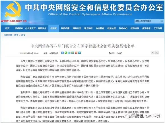 附:中央网信办等八部门联合公布国家智能社会治理实验基地名单-中共中央网络安全和信息化委员会办公室(cac.gov.cn):http://www.cac.gov.cn/2021-09/29/c_1634507963276896.htm